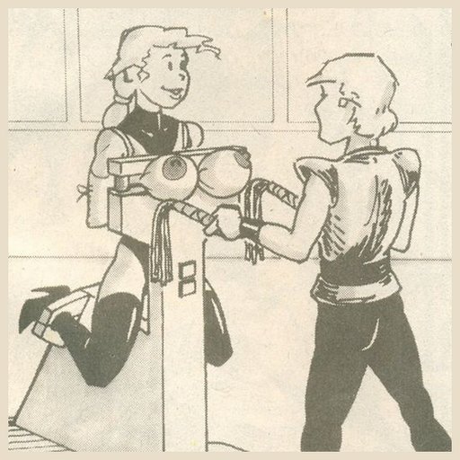 This is the least-severe from a set of four breast-whipping (and paddling, and caning) comic panels at Bondage Blog by the artist Depuceleur: