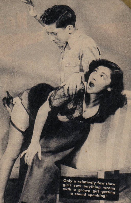 I don’t know the source of this, but from the visual style I’m going to call it an old (1960s or earlier) entertainment magazine doing a bit on showgirls getting spanked on stage: