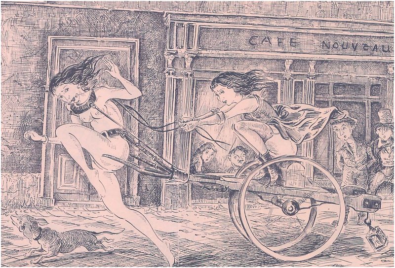 This old cart-racing pony girl illustration from Kitan Club poses a bit of a motivational mystery. Normally, it’s difficult to get this level of high-stepping maximum-effort athleticism out of one’s human pony without a whip in hand, but the fierce-looking domme here has chosen to keep both hands for the reins. But without a driving whip, what drives the pony?