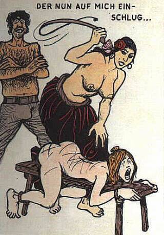 Here’s a vintage German postcard showing a fairly vigorous bondage whipping. Look at the crotch of the doofus in the background, he’s enjoying the show.