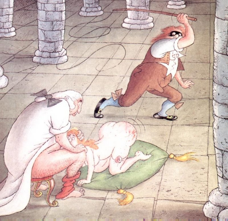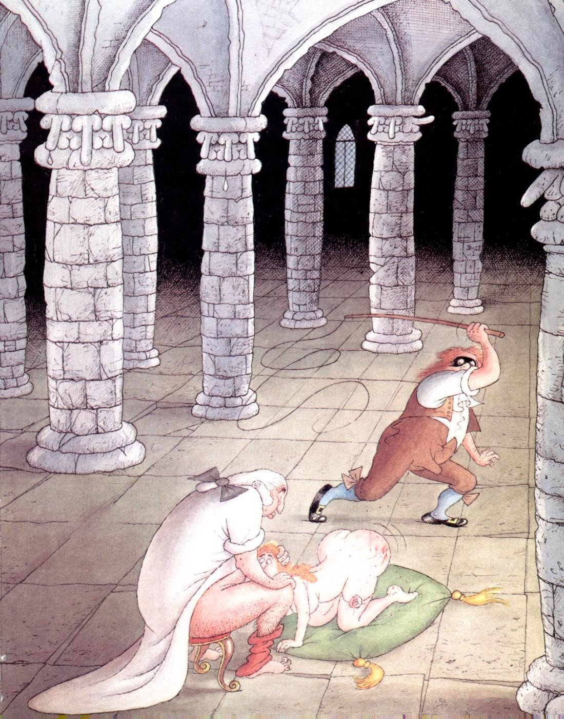 This illustration of enforced intimacies comes from a set of illustrations by Albert Dubout of scenes from the work of the Marquis De Sade: