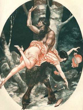 Sarah, you’re thinking of Mr. Tumnus, who was a faun and looked remarkably like our satyr here. The girl looks a bit like one of the Pevensie children, come to that, except for the stilettos!