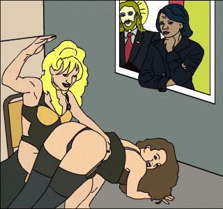 This is from a page with a political point I haven’t tried to figure out. But it’s got a nice spanking cartoon, with Jesus and Condi Rice watching:
