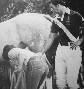 He’s not at a fair–he is at a polo match! He’s wearing a polo uniform. That is probably one of his polo ponies and the girl is probably his groom. It looks like she is about to wrap it’s leg (the legs are wrapped with strips of fabric for protection and support). Sorry to rain on the parade of all us spankos, but if you look closely you can tell he is pointing at and looking down at the horse’s leg and not at the girl’s butt.