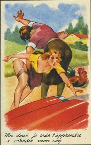 I’m French. It’s impossible to translate, “ma douĂ©”, which is a typical expression of Bretagne, the exact translation will be something like “gosh” or “”for Christ’s sake”. “Cock” means something for you, in America, but in France does’nt mean anything sexual. We are talking about a male chicken, not a penis. It’s an old post card. No double meaning. Just an antagonism between a fat woman from the country spanking a young girl from town.