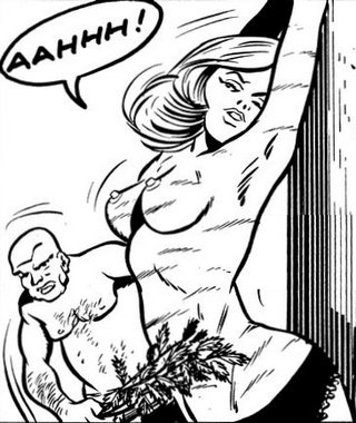 Although I still haven’t managed to get my hands on any nettles — much to Bethie’s relief — I continue to think that the combination of quite fearsome pain (to judge by various accounts I’ve read) and utter harmlessness make stinging nettles a promising sort of spanking toy. Here’s a comic book panel that features a nettle whipping: