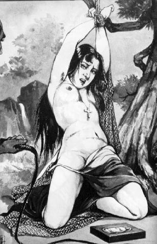 I’m not sure if the whipped woman here is supposed to be a nun — there’s not enough of her clothing visible for me to know — but from the crucifix and the icon, she’s obviously a good Christian woman at least: