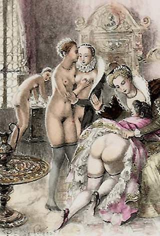 I have heard speak of a noble lady of the great world, one of the very noblest of the land. In truth she was a desperate harlot, not content with her natural lubricity, who had been married, and was now widowed, and was a very handsome woman to boot. The better to excite and provoke her passions, she would have her ladies, wives and maids alike, stripped naked, especially the fairest of them, and she did take much naughty pleasure in gazing at them.