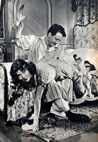 This is (according to Le monde de la fessée where I found it) actress Sophie Desmarets getting spanked by Jean Desailly in a 1951 movie called Demain nous divorçons (“Tomorrow We Divorce”, I think):