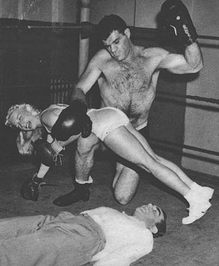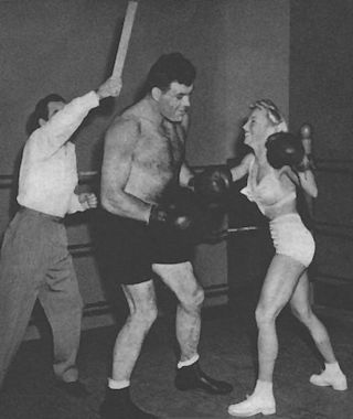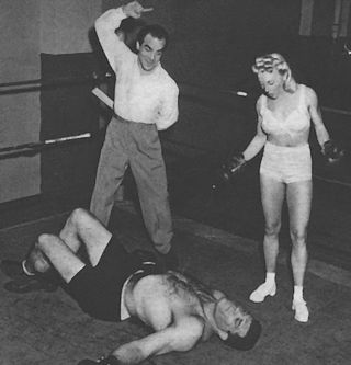 The following three photos, clipped from an old sports magazine, prove, if nothing else, that ringside shenanigans were not invented by professional wrestling. In fact, this gag is probably every bit as ancient as the basic idea of guys hitting each other for entertainment. First, distract Our Hero with a pretty girl: