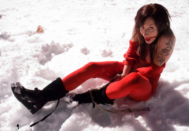 I didn’t really expect to enjoy this snow bondage photoshoot from Hogtied.com when I first saw it. Sure, grown women in fuzzy zippered sleeper pajamas with feet (just like I used to wear when I was four years old) have some potential; but this first photo reminded me uncomfortably of a hunter who has caught a deer. Er, no thanks.