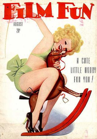 Looking at this vintage Film Fun cover (from here, link via ErosBlog) I was forced to ponder the question: If a girl swings a riding whip when she’s on a hobby horse, who exactly is she trying to encourage?