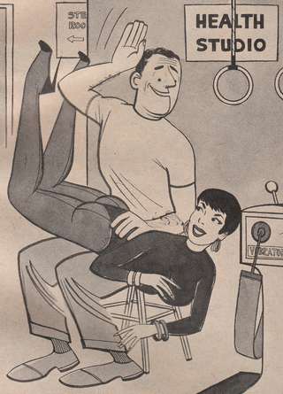 Here are just two of five groovy spanking cartoons republished in nice hi-res scans over at the Vintage Sleaze blog. Don’t pay any mind to the blathering about violence over there, they apparently don’t understand about light-hearted kink or the idea of the consensual spanking. But it hasn’t impaired their scanning skilz: