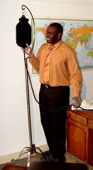 He must have been unimpressed with her reaction, because he wheels out the enema stand with a triumphant grin. “Laugh at me, will ya? Let’s see if you laugh at this!”