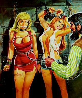 Via Chross comes this link to a blog post about Basil Gogos paintings for adventure magazines. Among the included examples are two sets of girls showing recent evidence of painful whipping: