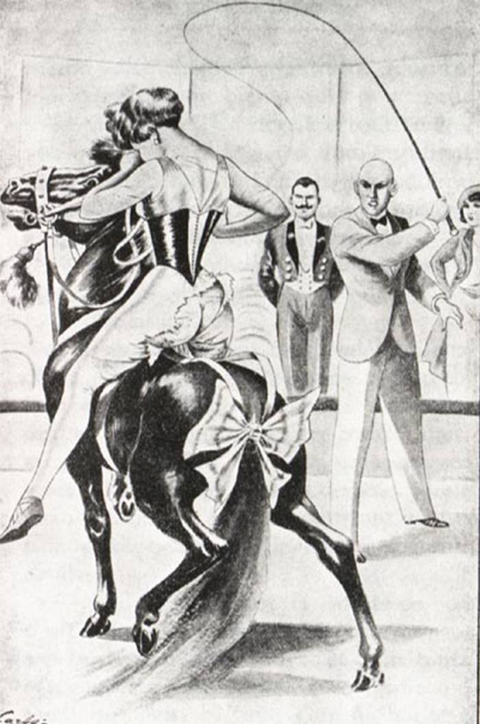 I don’t have the upbringing to properly name the fancy riding tights this girl is wearing, but I’m aware of a sort of micro-fetish around the idea of whipping the clothes right off a girl, by whipping so severely that tightly-stretched fabric begins to fail. That’s what’s going on here in this vintage illustration by Carlo: