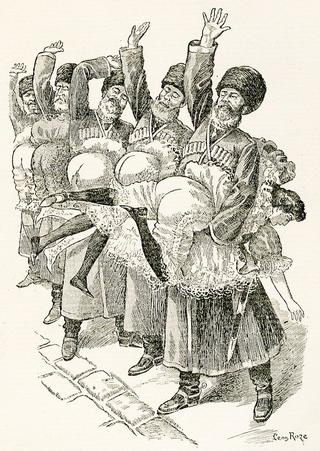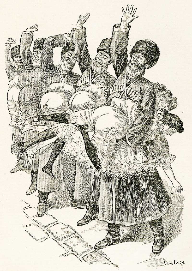 I don’t know who the five big furry Cossack-looking cavalry officers are supposed to be, but they seem to have brought military precision to their girl-spanking drill: