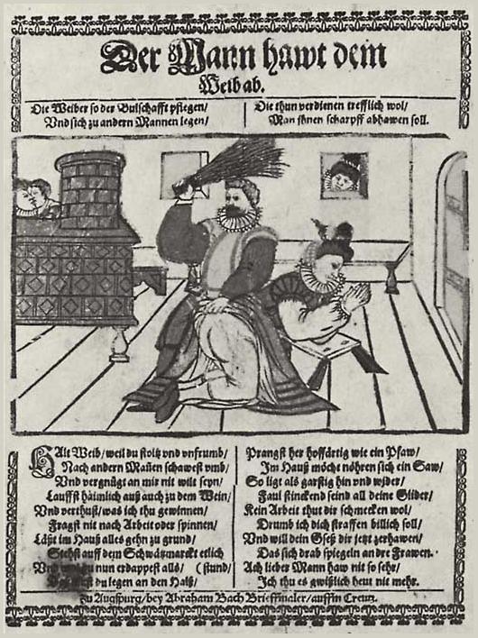 From a 17th-century woodcut found at ErosBlog, here’s “a man beating his wife for being proud, impious, lazy, and drunk”: