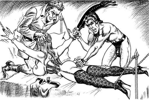 […] bondage is a bit weak in this Bill Ward illustration, but the cooperation is excellent: she’s tied with ropes to the four corners of the bed, on […]