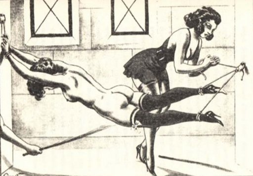 […] this vintage bondage art by Carlo a girl is tied wrists and ankles by cruel thin cords in preparation for a […]