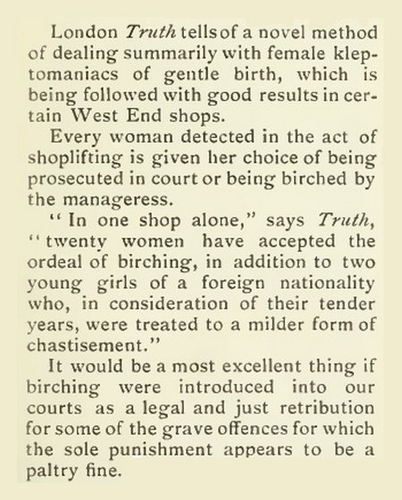 Abel has found a newspaper account of sorta-consensual (as in, agreed-to to avoid prosecution) private birchings for “female shoplifters of gentle birth”: