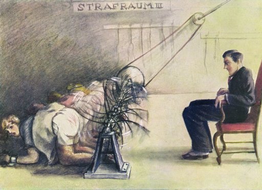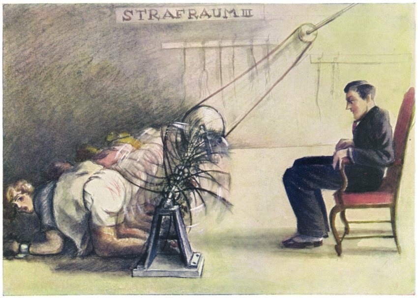 The title or caption in German is given as “Meine Erfindung – Phantasiezeichnung eines sadistischen Intelektuellen” — which me and Google working together translate as “My invention – An Intellectual’s Sadistic Fantasy Drawing”. As always, cunning linguists and native speakers are welcome to chime in with better translation efforts in the comments! Within the artwork itself, you can see the caption “Strafraum III” from which I get the “Punishment Room 3” title for this post.