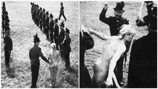 Now here are a couple of stills from a 1966 Hungarian movie, showing a naked blonde female prisoner forced to run a painful gauntlet of uniformed men: