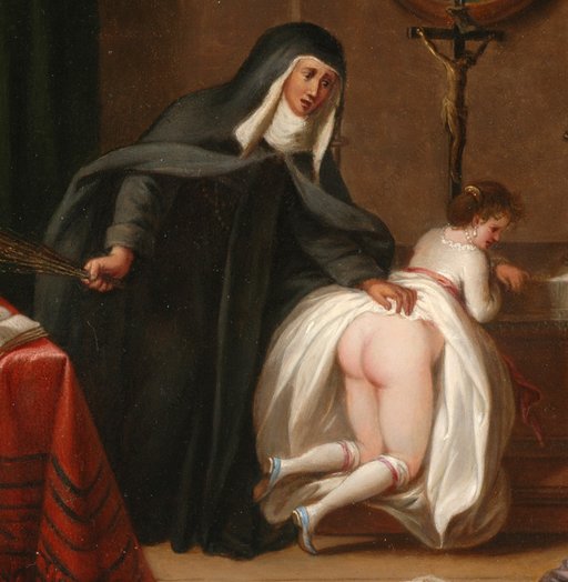 More than five years ago I posted small images of this Adam Johan Braun oil painting from 1789 showing a nun birching a girl as two other girls look on in tears. The images were from an auction house and quickly vanished from the web after the auction was over. Well, much that is good eventually returns. Now, via another art dealer who gets no link because of intrusive watermarking practices, and courtesy of the watermark removal efforts of volunteers at the Wikimedia Commons, I can show you much nicer images of the painting, in higher resolution. Don’t forget to click these pictures to enlarge them!