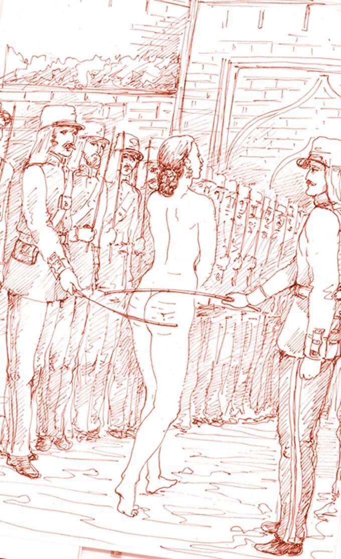 Wow, what a great illustration. It reminds me of that scene from “The Round-Up”, referred to in one of the links below. I wonder if that’s the inspiration? I like that you can’t see how long the gauntlet actually is. I suppose it could go on and on and on…