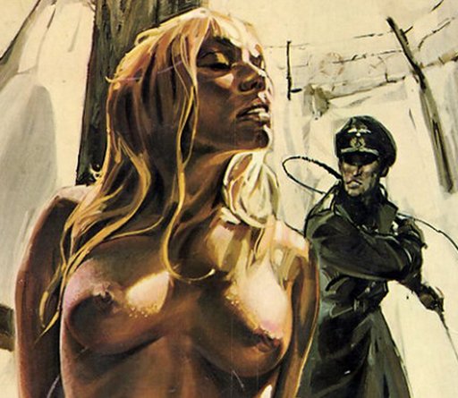 This harsh bare-breasted whipping in a Nazi prison camp comes from a book cover, and was found via Kinky Delight: