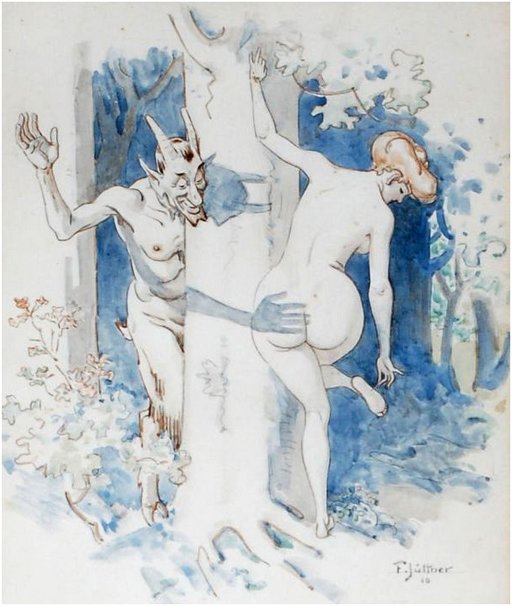 The watercolor is Satyr und Nymphe, from 1910, painted by Franz Albert Jüttner.