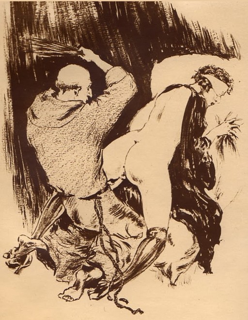 She’s blindfolded, but not restrained in any fashion. Perhaps it’s just that she’s not supposed to know which faithful brother of the church is scourging and boning all her sins away?
