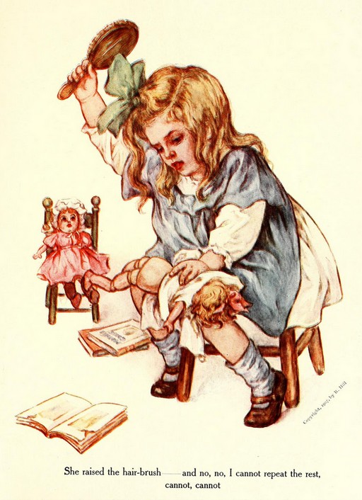 She reached out for a great big hair-brush that was on a dressing-table near her. “A hair-brush,” I thought, stupidly. Oh! I was all dazed. “What does she want with a hair-brush. My hair must be untidy, and I guess she’s going to comb me.” Yet I trembled.