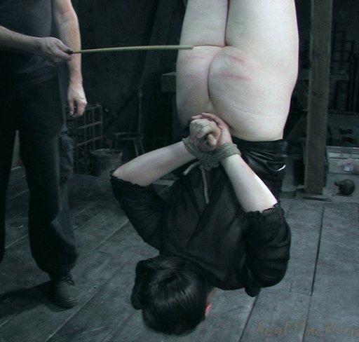 A fully inverted suspension is physically and mentally demanding for any BDSM submissive or model. Which is, I think, why one does not often see it combined with a good hard caning. It is therefore impressive to see Catherine de Sade pull the combination off with panache, while managing to suggest with her expressions that she’s enjoying herself and could handle more: