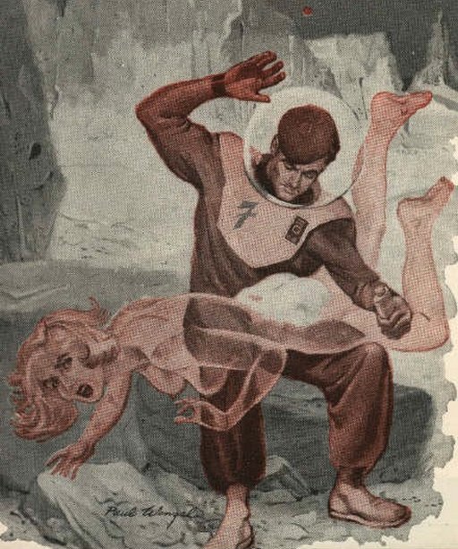I saw this pulp art on Dave Wolfe’s blog and put a lot of effort into trying to track down its source. I failed. But the signature looks somewhat like that of Paul Wenzel, a pulp artist who among other things did a lot of work for Disney. This looks like the illustration at the start of an interior story in one of the pulpy adventure or science fiction magazines: