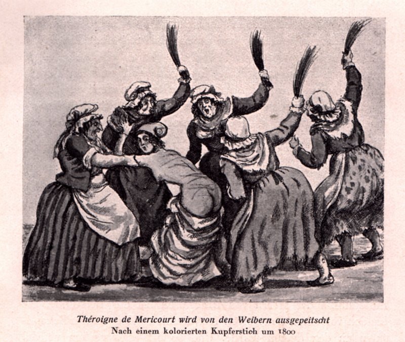 Per Wikipedia, this scene would appear to depict a sort of rough political argument from the French revolutionary period. It is said that Théroigne de Méricourt was delivering a speech in May of 1793 when she was attacked by a group of women allied with the Jacobins. The women, objecting to her pro-Girondin sentiments, stripped her naked and beat her severely.