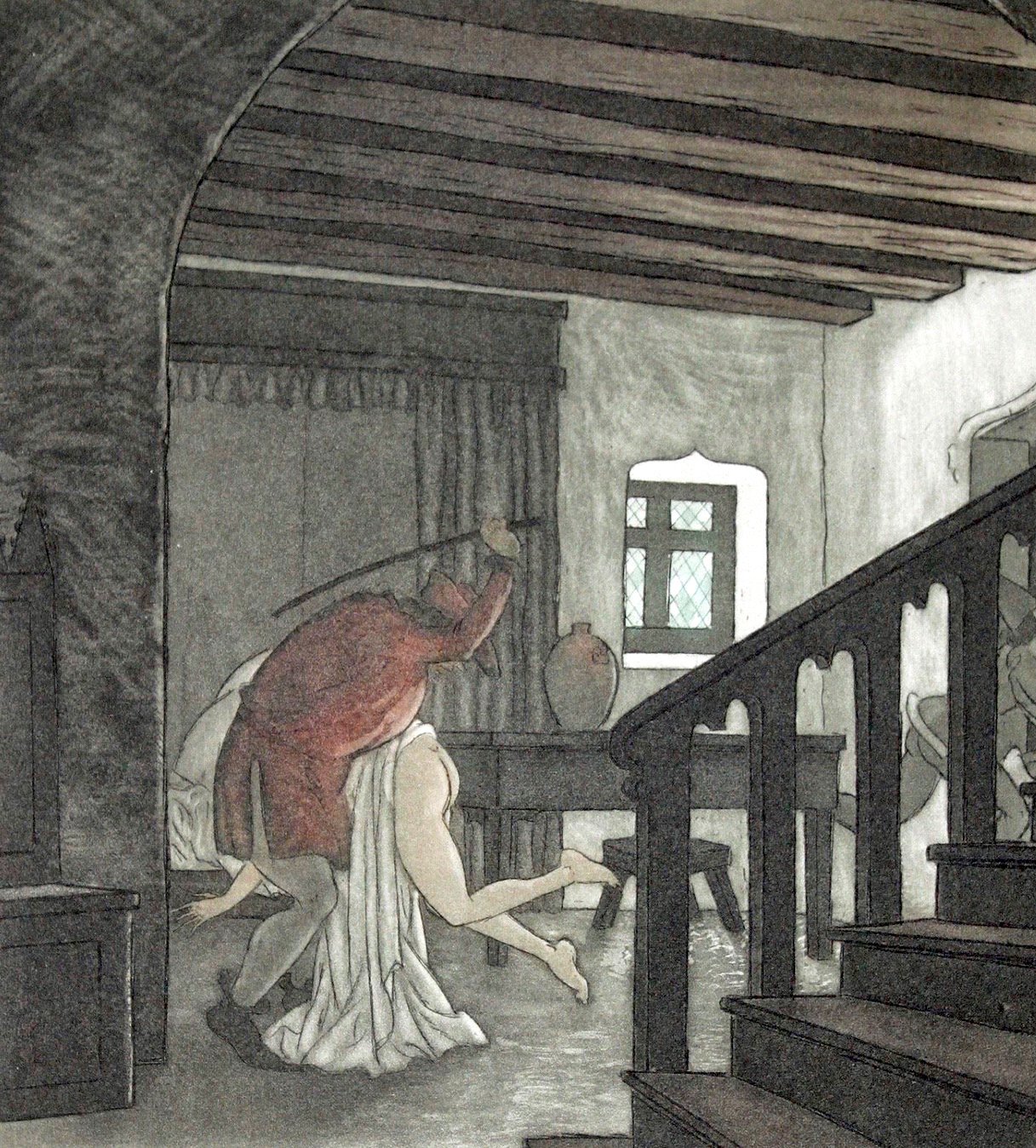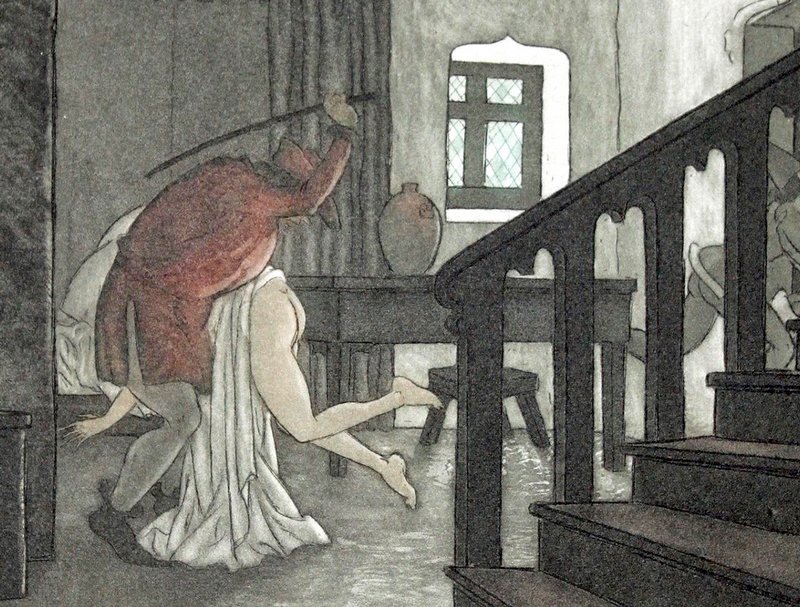 Apparently in the fifteenth century, wife-spanking was counted among the joys of marriage. Or so I deduce from this illustration by Maurice Leroy in a 1941 edition of the fifteenth-century book Les Quinze Joyes De Mariage (“The Fifteen Joys of Marriage”) by Antoine de La Sale: