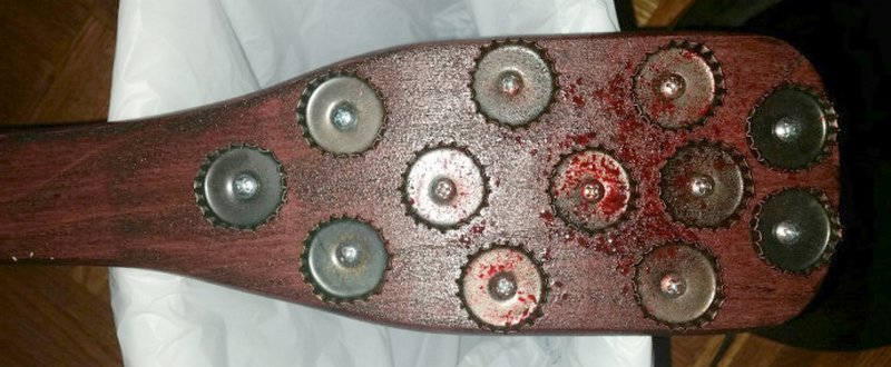 Well here’s an evil spanking scheme. What kind of sadist nails bottle caps to a wooden paddle? This kind, apparently: