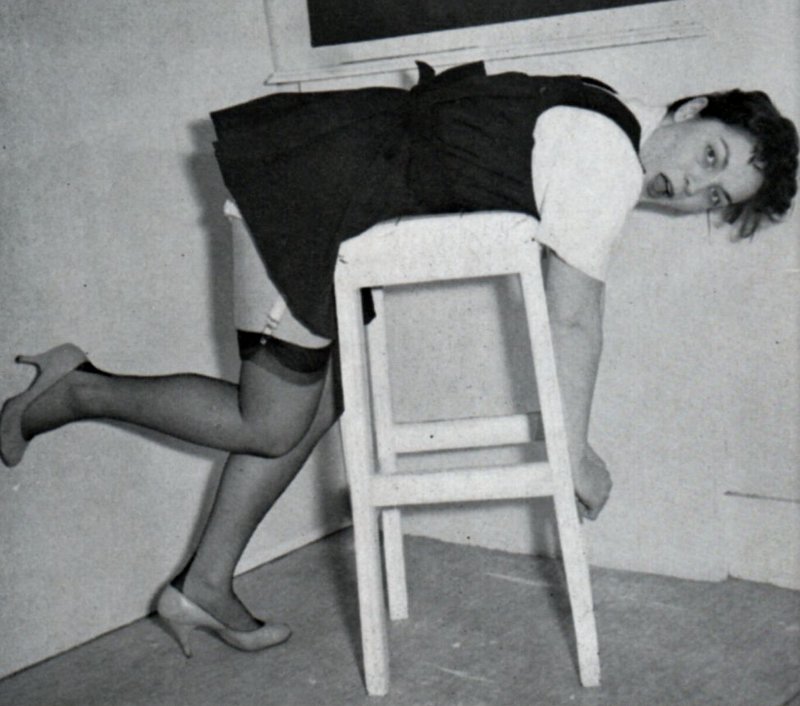 This photo is from a foolish little photoset in a 1950s pinup magazine (Span #45, May 1958). Maureen Jeggo plays a ditzy maths student who wants to be corrected, “but not this kind — ow! — of correction!” Sadly there is no actual spanking or caning anywhere in the photoset; it’s all hint and tease, as was normal for the pinup mag genre of that era.