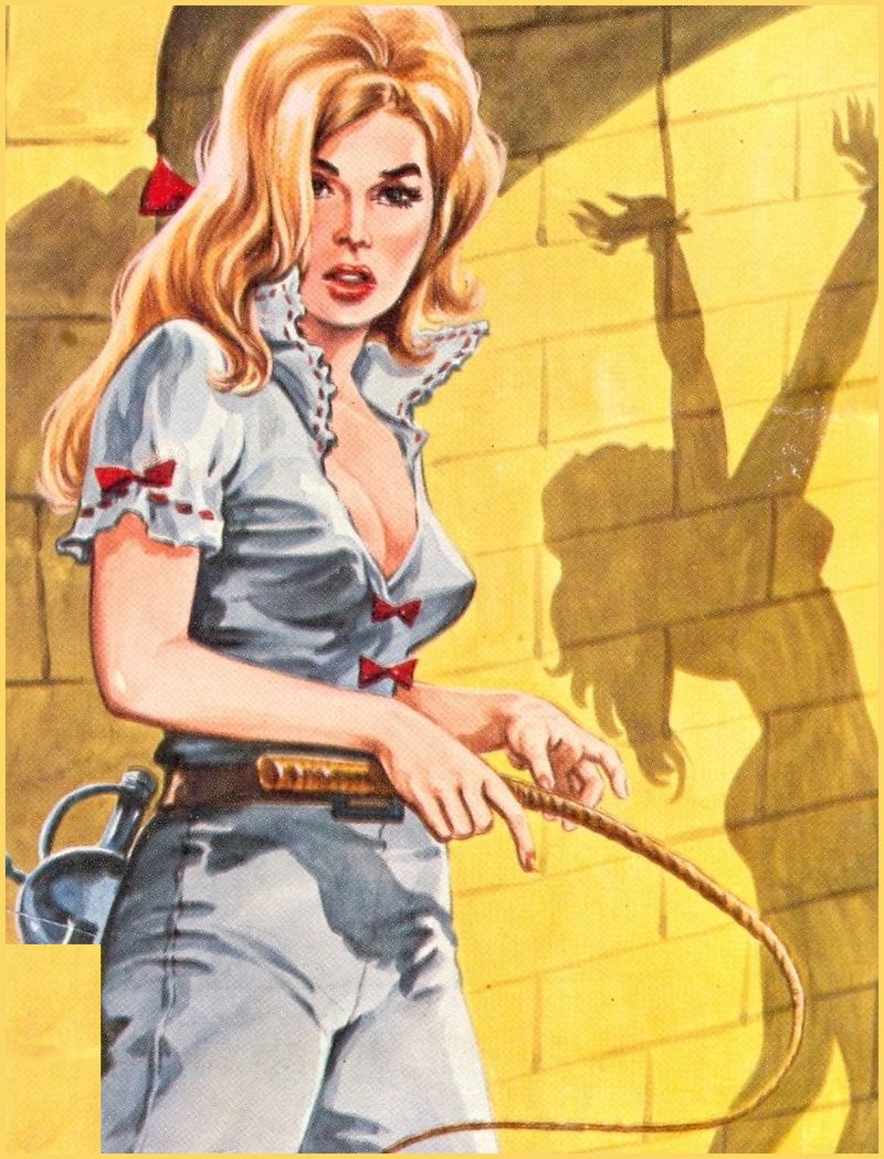This is pulp art, not safe-sane-consensual BDSM documentary. Maybe she’s carrying the sabre in case she gets attacked by her enemies before she finishes delivering the whipping?