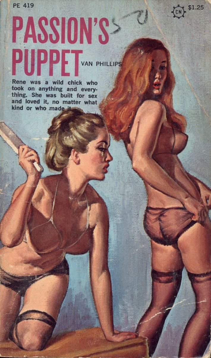 This pulpy lesbian spanking art is from the front of a life-in-the-sorority pulp novel called Passion’s Puppet. Artist not known.