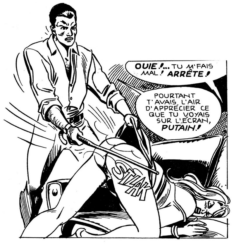 I haven’t tried to decipher the French-language speech bubbles in this caning panel from an unknown comic, but I’m pretty sure he’s calling her a whore.