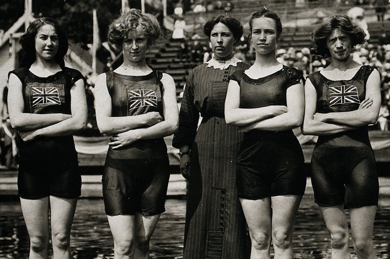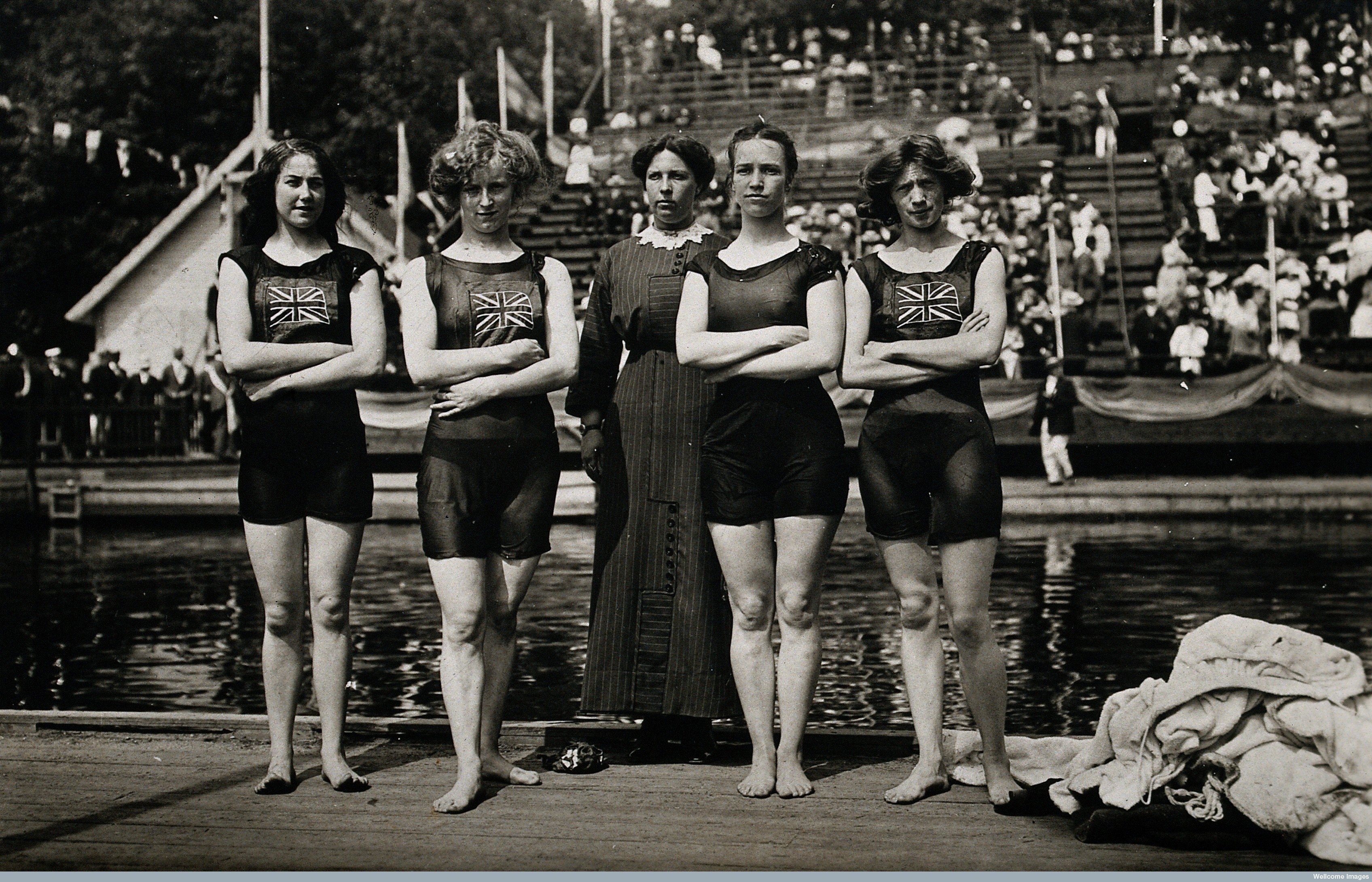 This is the 1912 British Olympic Women’s swimming team, and those swimsuits were considered scandalous in the extreme at the time. The woman in the middle is usually referred to in photo captions as a chaperone, but in some sources as a coach. Either way she appears formidable. This woman brought a cane to the Olympics in her luggage and will be entirely unsurprised if her duties demand its use!
