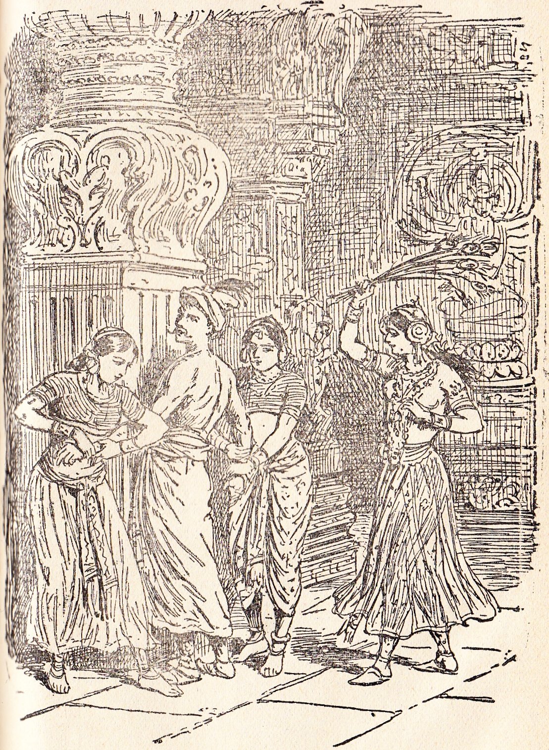 Inquiring minds would very much like to know: why is this man with the impressive mustachios being beaten with peacock feathers by three sturdy women of the harem?