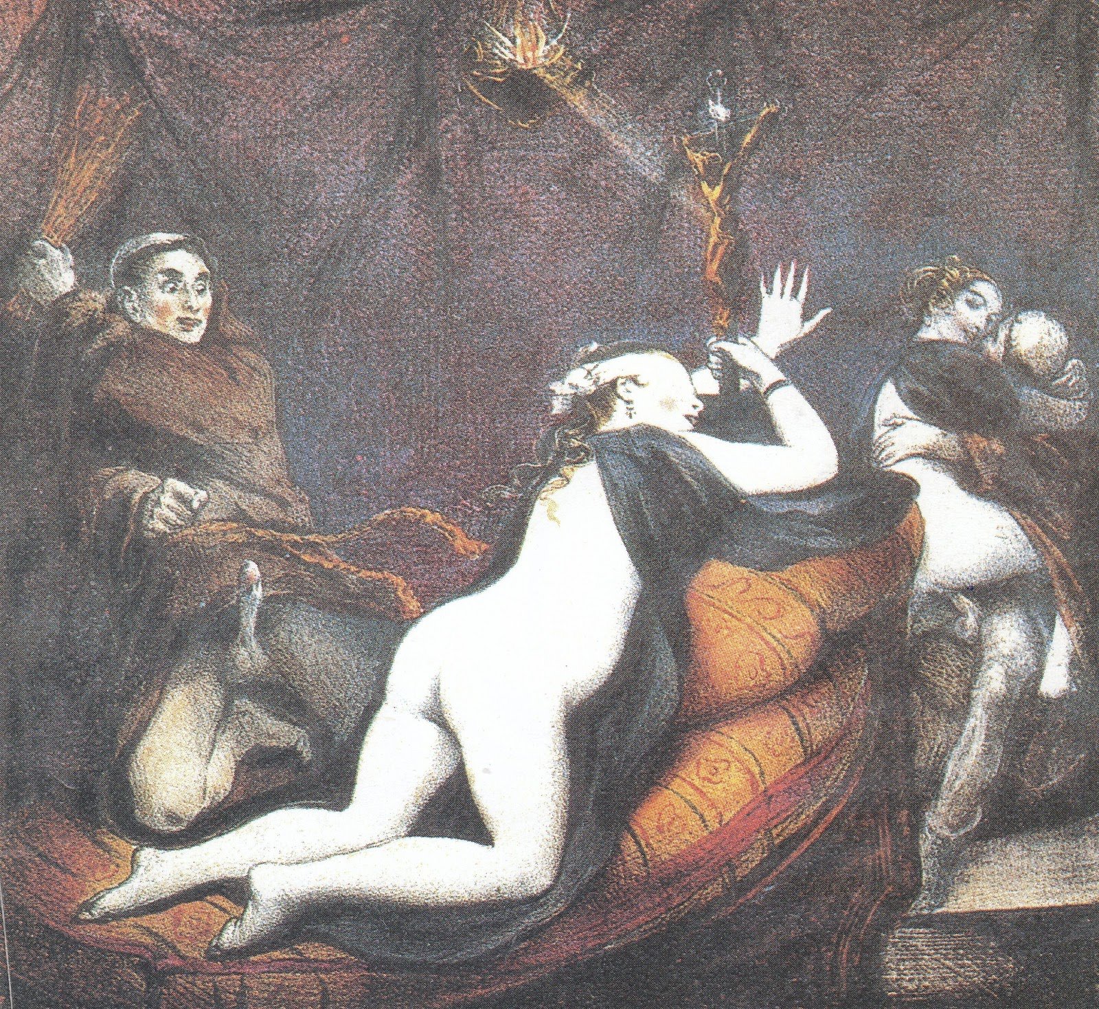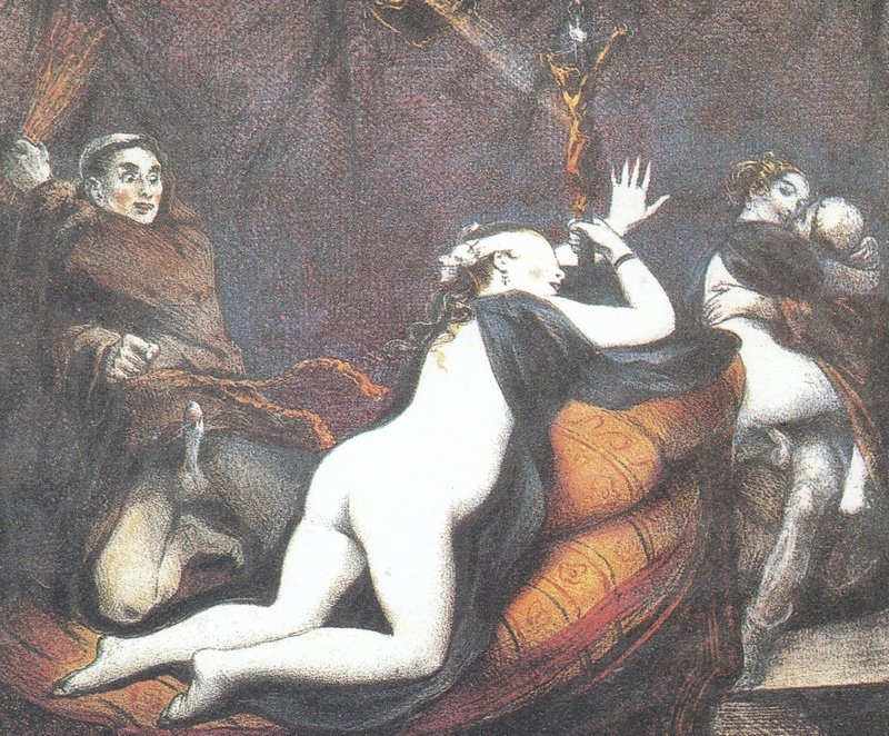 The artwork is from (per this source) a rare 1928 edition of French erotica to which two different artists contributed illustrations, so I’m not sure whether this one should be attributed to Achille Devéria (1800 – 1857) or Henri Grévedon (1776-1860).