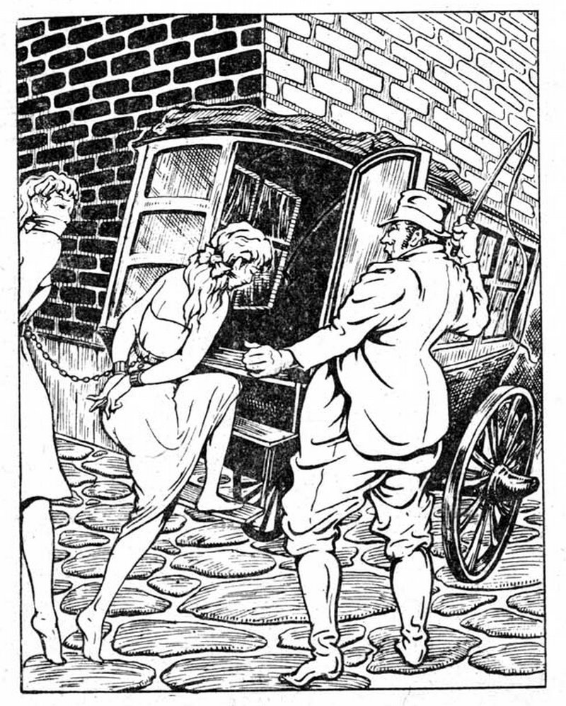 Not arrestees or slaves (for why gag them?) but they are wearing expensive shackles and being loaded into an expensive carriage. Captive playthings of a rich man, being hauled discretely through city streets at night?