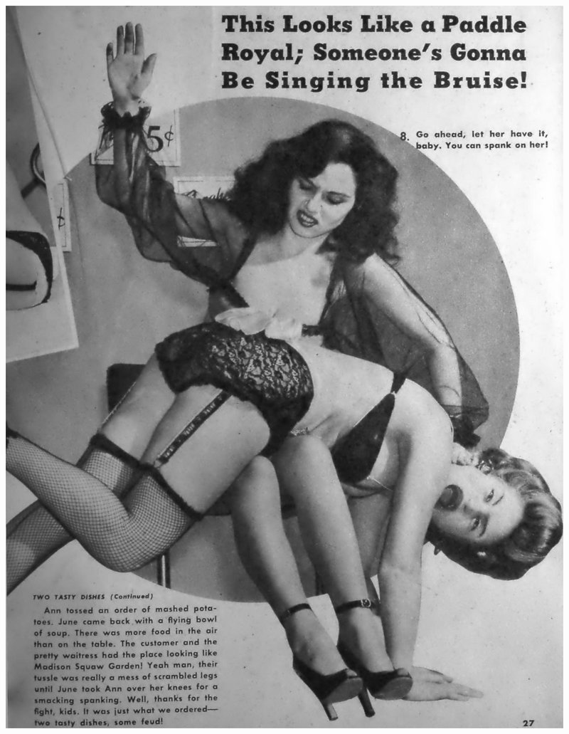 This silly OTK catfight-spanking is from a contrived scene in the October 1947 Eyeful magazine. Supposedly two waitresses (only they ain’t exactly dressed for work) get in a catfight that gets resolved with the spanking you see here: