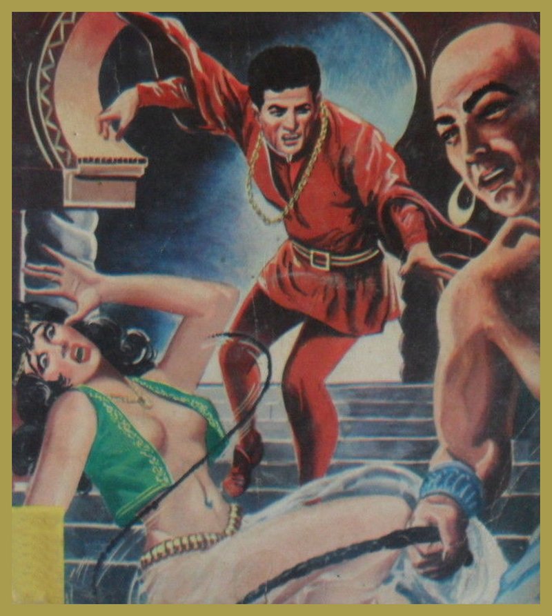 This Italian pulp-cover harem whipping scene is interesting to me mostly for the gender ambiguity of the character doing the whipping. I suspect in its 1970 or 1980 context we were intended to read this person as the stereotypical harem “eunuch” but the earrings and eyebrows encode something like “sadistic drag queen” to my 2018 eyes: