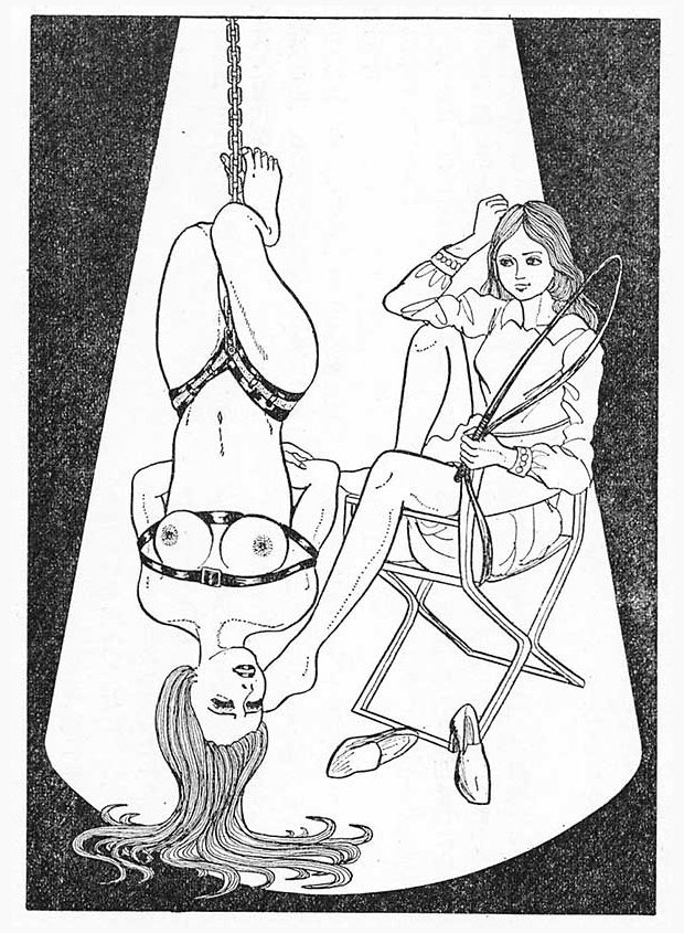 Now that she has her victim is chained upside down, our contemplative villainess plans to take her time and enjoy delivering a nice slow whipping: