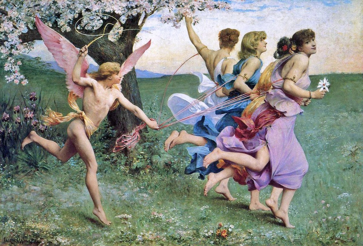 Artwork is Chariot of Love (1880) by French painter Jacques Clement Wagrez.